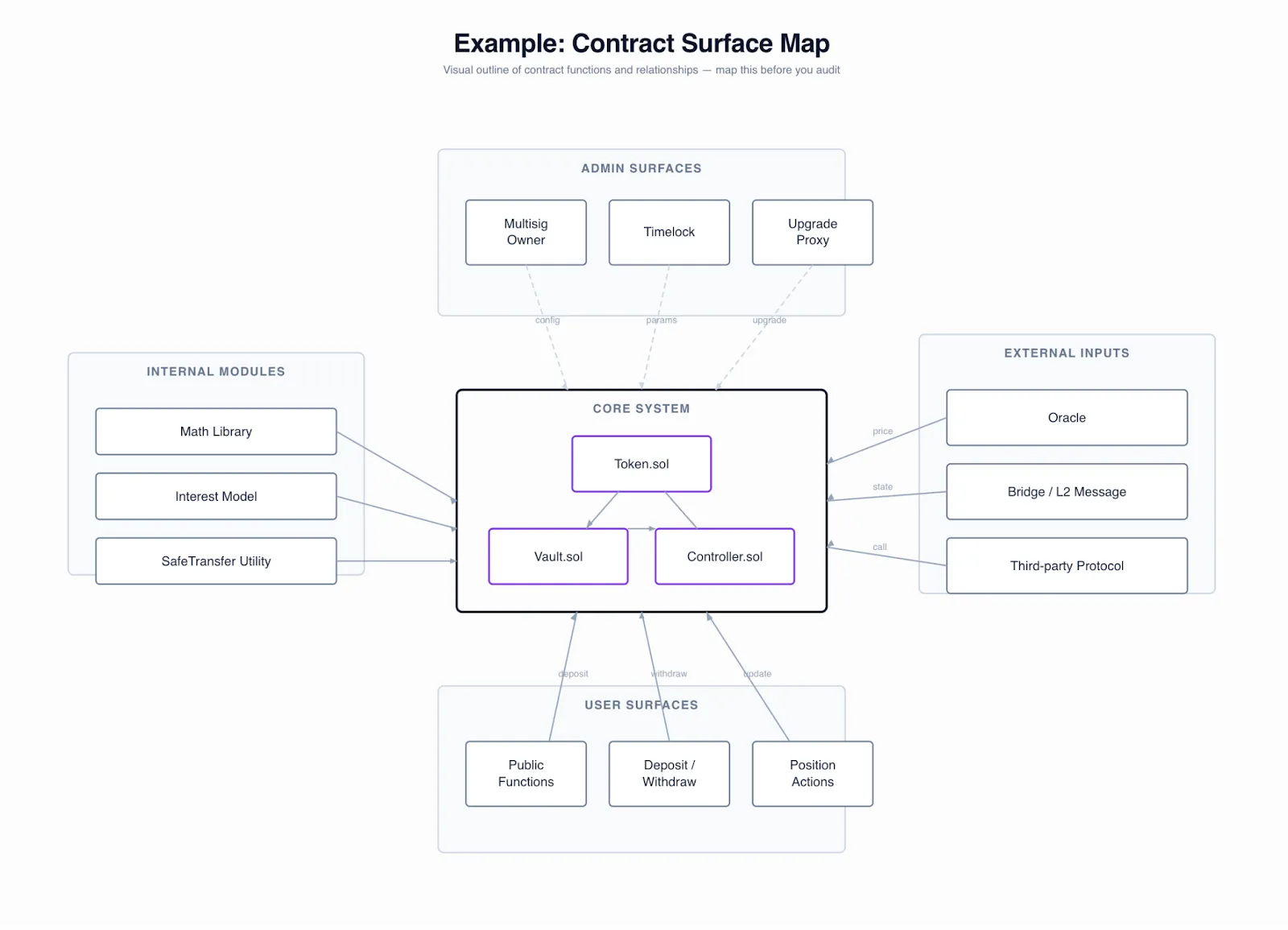 A strong self-audit starts with a clear map of what’s actually in play. Contracts often accumulate helpers, experiments, unused modules, legacy patterns, and half-finished ideas over months of development. If you begin reviewing without untangling this, you lose time and miss context. Sherlock sees this frequently during onboarding: teams jump straight into security thinking while the project structure itself stays messy. The simplest first step is to group contracts by purpose, trace how they talk to each other, and list which ones are meant to touch user funds. This alone removes confusion and gives structure to everything that follows.