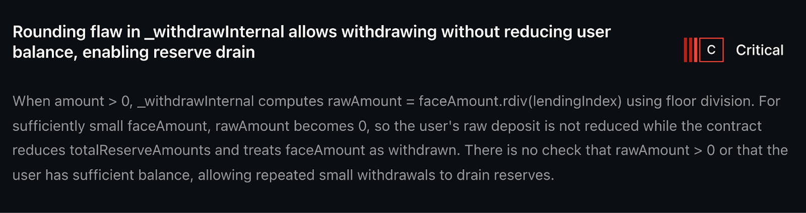 If faceValue was small enough, scaledDelta became zero due to integer division. When the function went on to update balances, the user’s account remained unchanged. But when it updated reserves, the full faceValue was still subtracted.