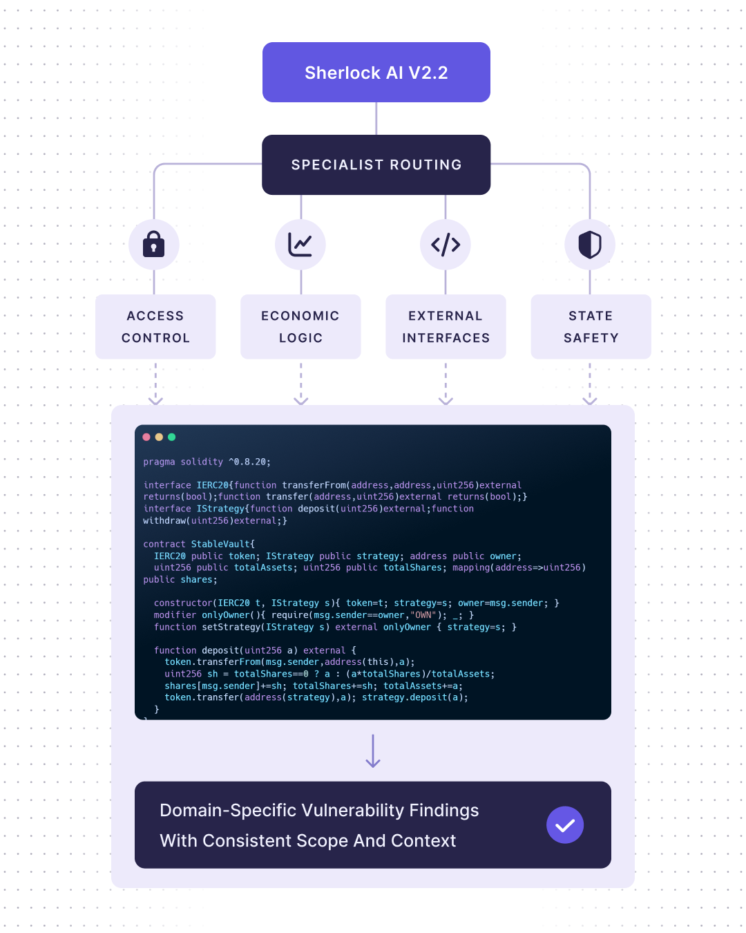 Sherlock AI now uses domain-specific analysis workflows, called specialists, coordinated by a planner. The planner analyzes the codebase, determines which risk surfaces are present, routes scopes to the relevant specialists, compares their findings, and coordinates follow-up passes when signals overlap or conflict.