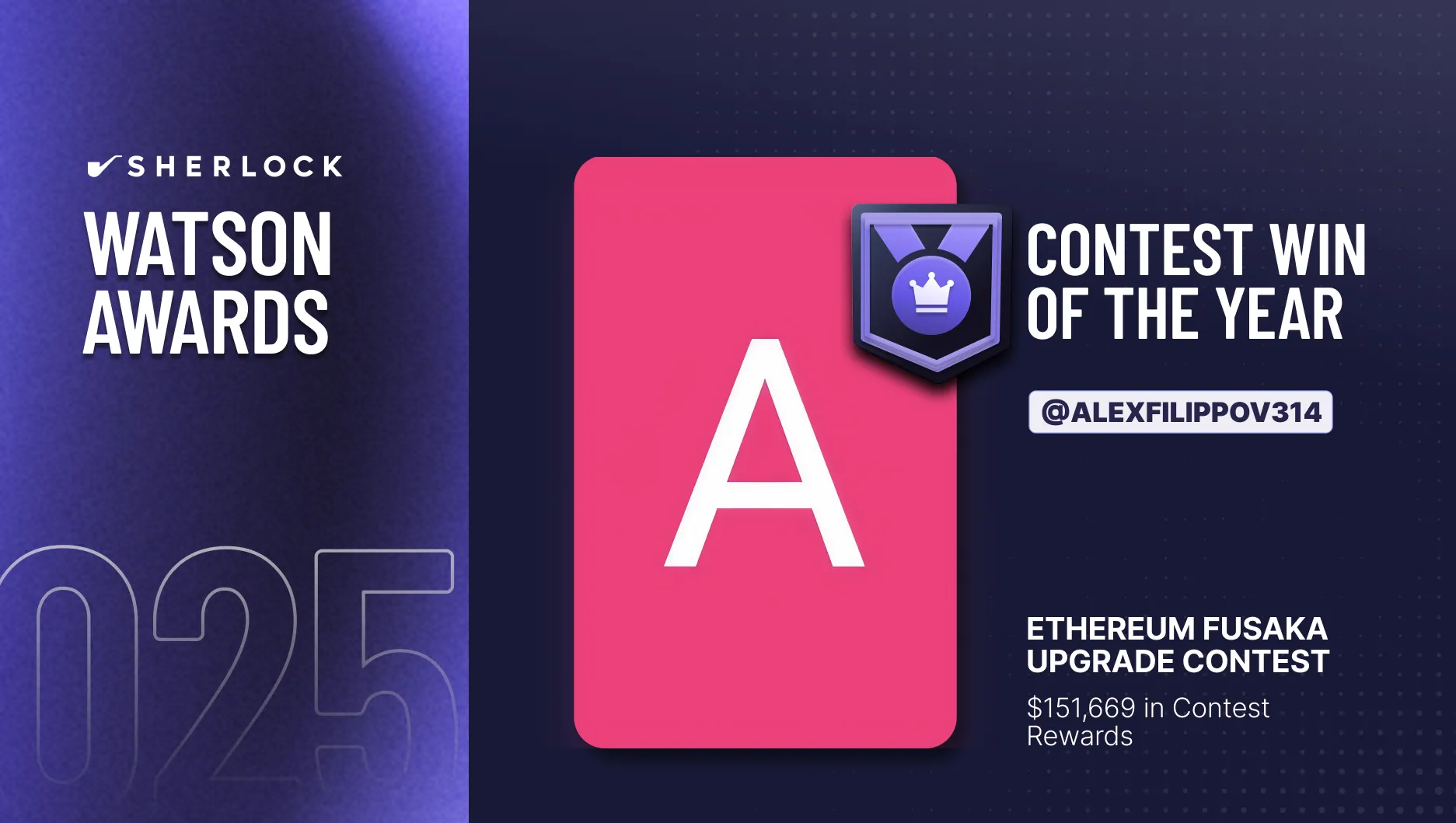 Alexfilippov314 won the Ethereum Fusaka Upgrade Contest, identifying multiple highs on his way to $151,669 in rewards. While this was not the single largest payout on Sherlock this year, the importance of identifying high-severity vulnerabilities in a major Ethereum upgrade is extremely significant. This is also the second Ethereum upgrade contest that Alex has won in a row, an outstanding accomplishment that we must recognize.