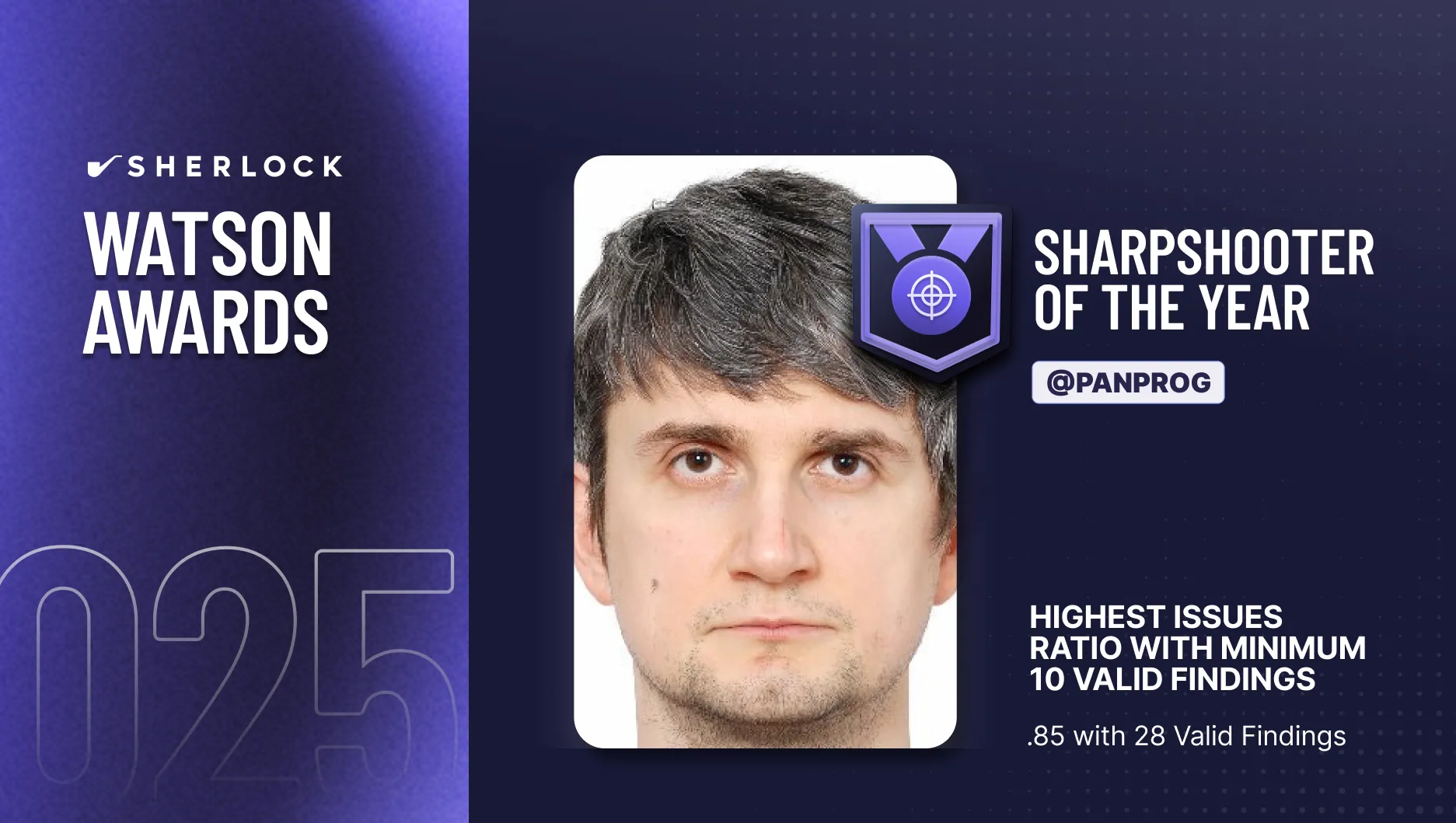 The Sharpshooter of the Year is given to the Watson who has the highest issues ratio with a minimum of 10 valid findings. The "issues ratio" is the ratio between total submissions and valid vulnerabilities identified.