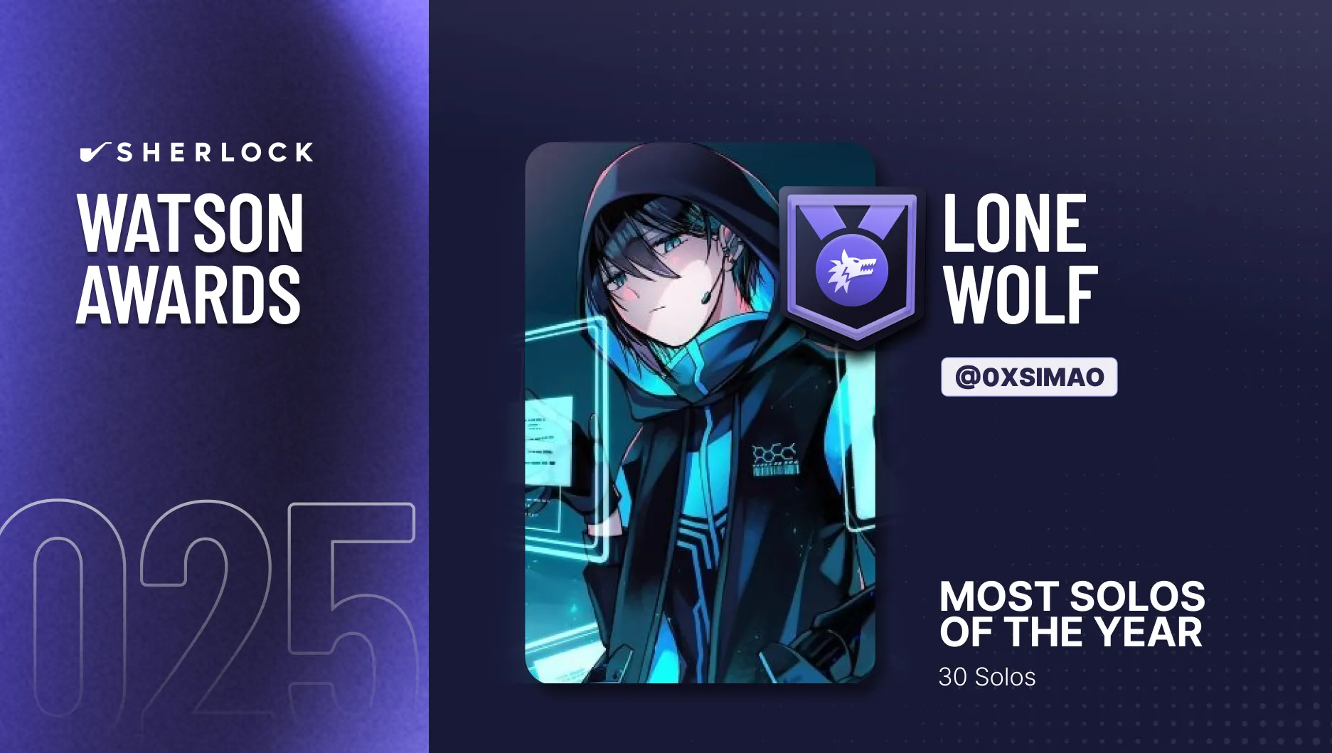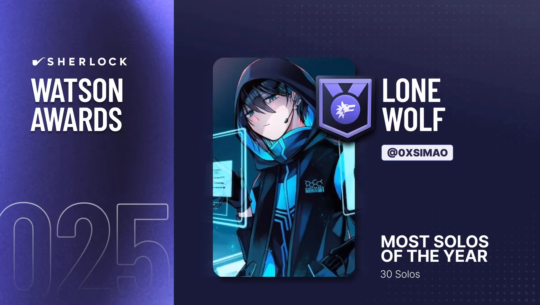 The Lone Wolf award is given to the Watson who had the most solo findings in 2025. A solo is a valid vulnerability that no one else in the contest identified.