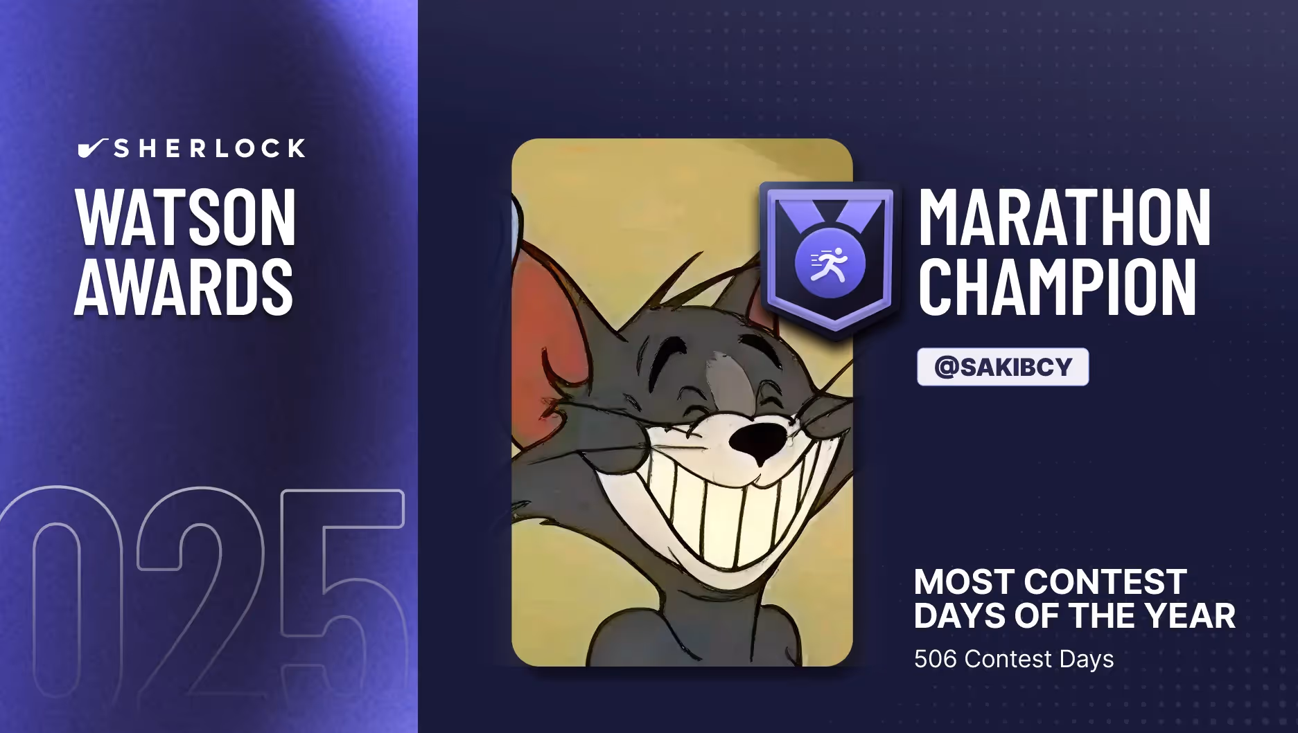 At 506 contest days, Sakibcy was competing in at least 1 contest every day, and many times more than 1. This award is an incredible achievement in perseverance and dedication to security.