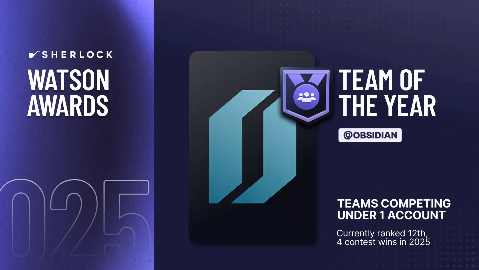 Obsidian is an auditing team comprised of 0xSpearmint and 0xJuaan. Together as Obsidian, they are ranked 12th on the Sherlock leaderboard and had 4 contest wins in 2025. It’s great to see talented researchers coming together to provide higher-quality security to the ecosystem.