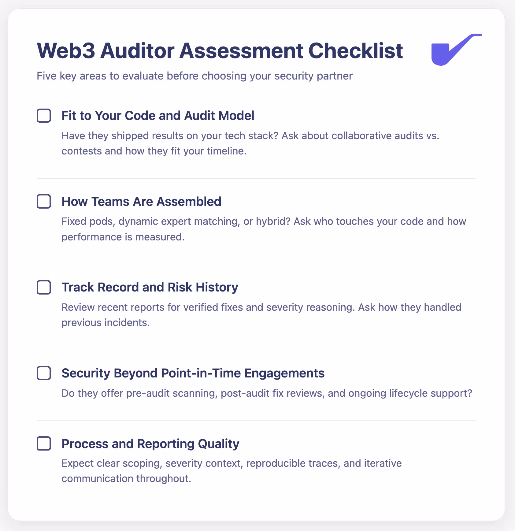 The purpose of an audit is not just to “pass review,” but to reveal how well your system holds up under expert scrutiny. A good auditor does more than list issues. They help teams understand risk, validate assumptions, and improve the overall design. Choosing the right partner starts with knowing what quality auditing actually looks like.