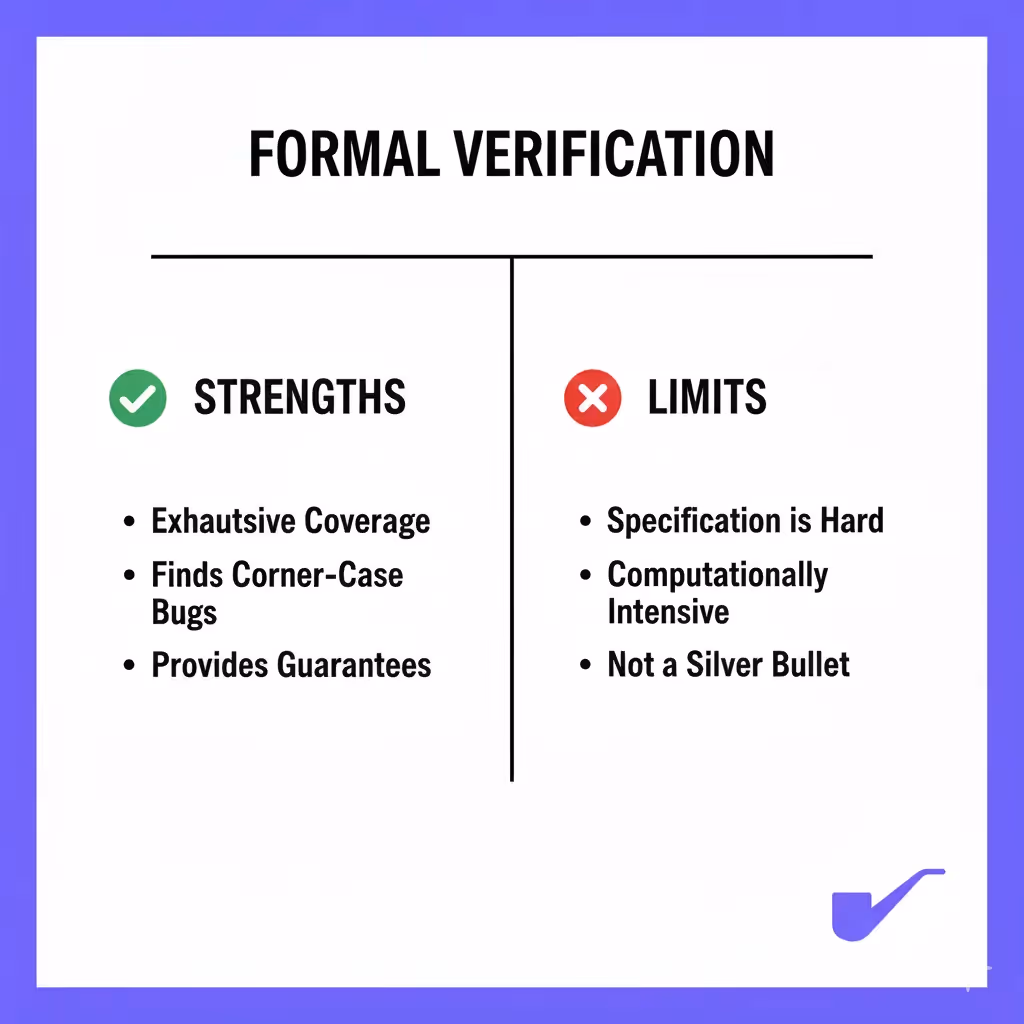 - Provides Guarantees: It moves security from probabilistic ("we're pretty sure") to deterministic ("we know for a fact") for the properties verified.